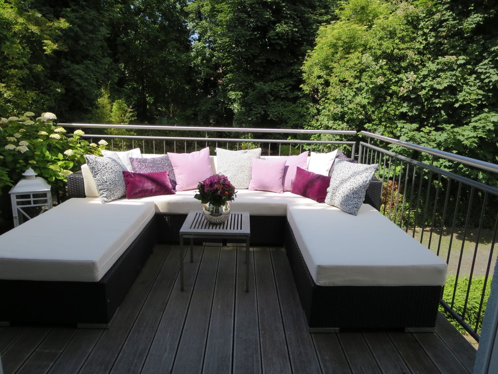 Es braucht nicht viel! Ein paar schöne Übertöpfe, Hortensien der Sorte „Endless Summer“, Fleißige Lieschen, Windlichter mit Kerzen, viele Kissen in verschiedenen Farben für die Sitzmöbel.